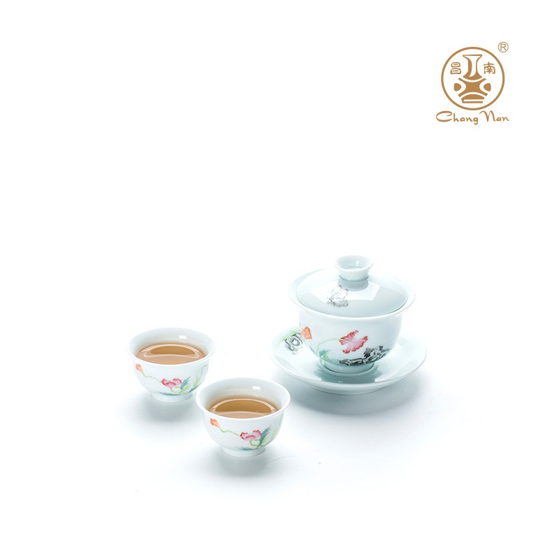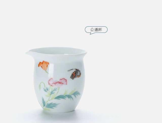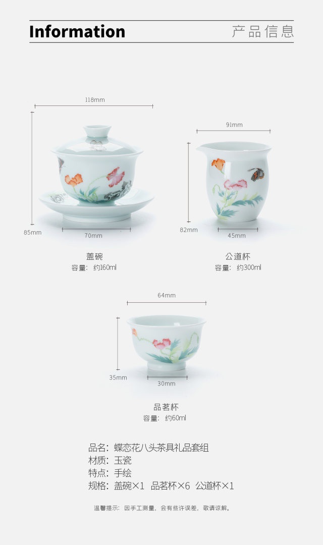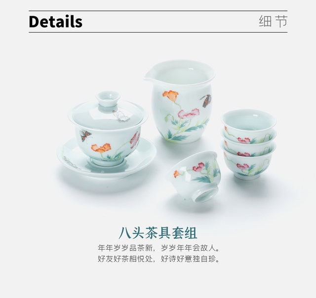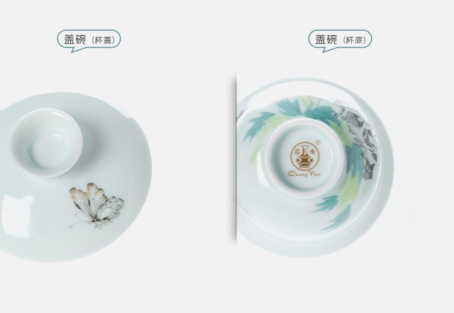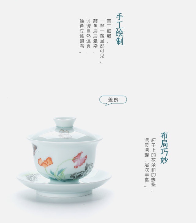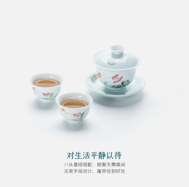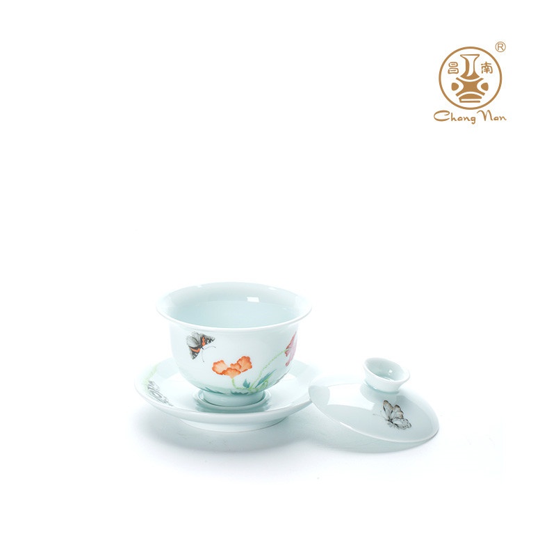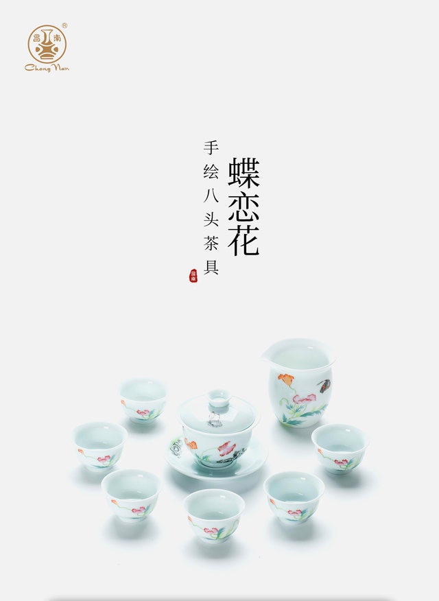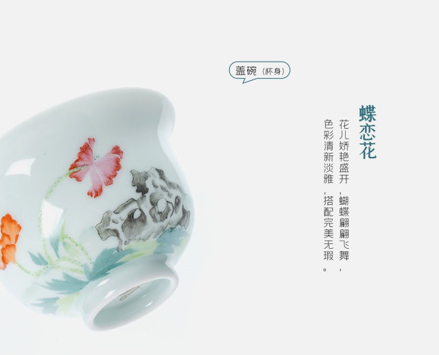 玉瓷手繪“蝶戀花”8頭蓋碗茶具套裝